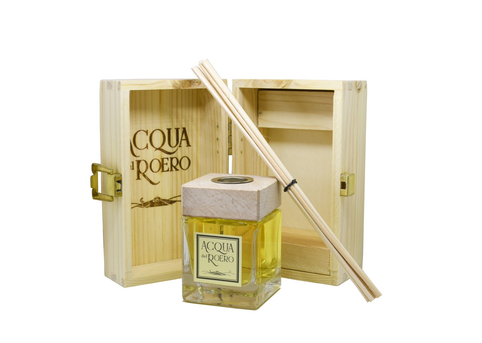 Il profumatore Acqua del Roero è composto da: un diffusore per ambiente e bastoncini in legno adatto a profumare ambienti di massimo 10 mq.