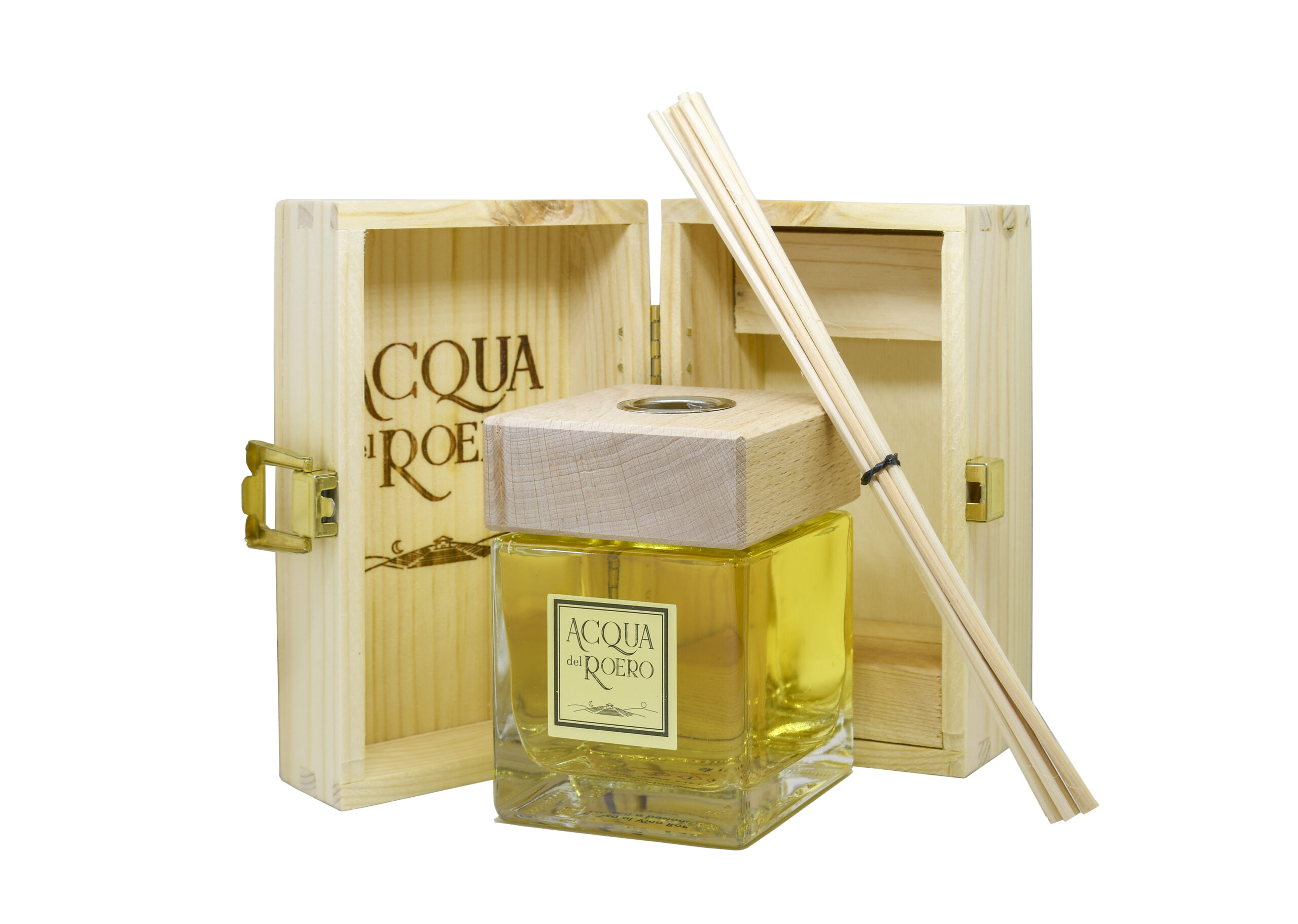 - n.1 profumatore per ambiente (200 ml) al vino Roero Riserva con bastoncini in legno e adatto a profumare ambienti tra i 10mq e i 20 mq.
